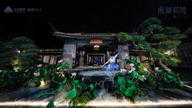 進入南湖荷院的示范區(qū),美若幻境的場布,將湖畔的詩意畫境盡數(shù)描摹。以“荷花”為主題裝點出的風雅意境,在“天圓地方”的景觀疊水中翩翩起舞的仙子,讓每一位嘉賓目極之處盡是世間之色?!盎\庭水樹宜涼影,匝砌煙花帶露姿”,這一處湖院盛境,把中國傳統(tǒng)獨有的內(nèi)斂、含蓄、唯美以及美好的向往融入其中。當細膩婉轉(zhuǎn)的越劇聲落,一段《風荷引》舞曲,以風荷舞蹈演繹出別樣的江南風情。青磚黛瓦、煙雨江南,一席清雅的水墨意境和著夜色輕述婉轉(zhuǎn),柔美的燈光、變幻的美景,讓身處其中的嘉賓,彷若進入一個穿越古今的千年美夢。